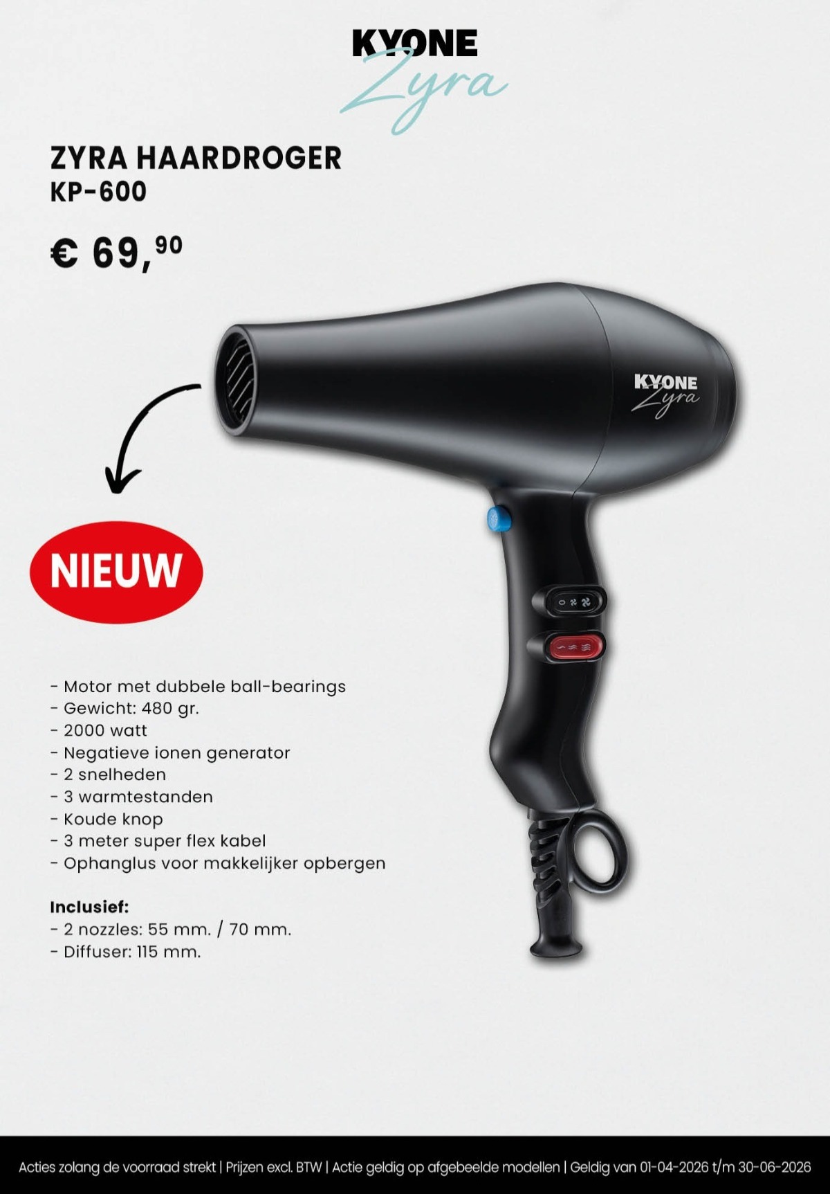 De Airbliss is een ware revolutie in de haardrogerwereld en de krachtigste en stilste Kyone haardroger. Met een ultralichte gewicht van slechts 340 gram en een fluisterstille werking van slechts 80 dB zonder hinderlijk gefluit is dit de ultieme must-have en een echte game-changer!